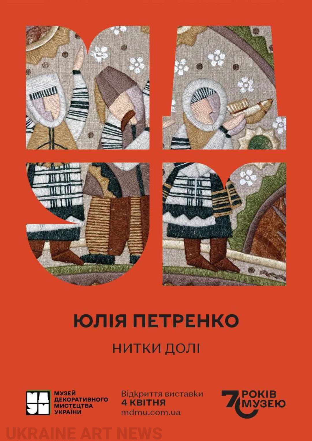 4 квітня о 16. 00 у Національному музеї декоративного мистецтва України відкривається виставка творів художнього текстилю «Нитки долі» майстрині з міста Бориспіль на Київщині Юлії Петренко.