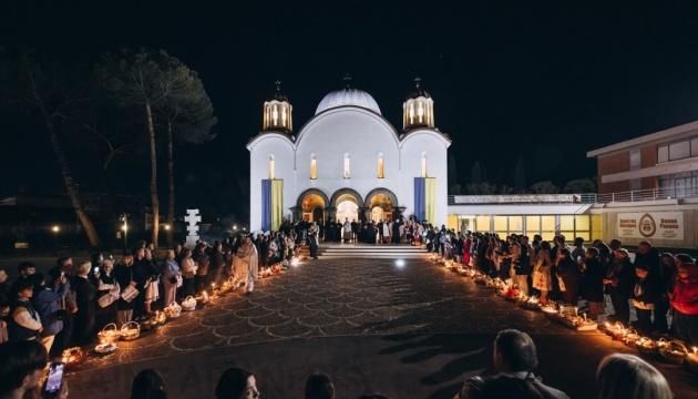 Пасхальні відправи розпочалися ще в суботу ввечері з Надвечір’я Великодня, яке очолив Владика Григорій Комар, Апостольський адміністратор екзархату для українців-католиків в Італії. Після обходу навколо святині віцеректор собору о. Дмитро Кудін вперше проголосив радісну звістку: «Христос Воскрес!»